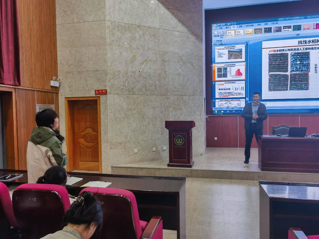 水稻作为全球重要粮食作物,一旦遭受病毒侵害将对粮食安全产生重大影响。孙宗涛研究员在详细解析水稻抗病毒机制时,运用了大量的研究数据和图表深入浅出地讲解了水稻自身免疫系统的工作原理,包括水稻是如何识别病毒入侵信号、启动防御反应等关键环节,让师生们对这一复杂的生物过程有了更清晰的认识。接着,他分享了团队在广谱抗病毒材料创制方面的最新成果。基因编辑技术结合传统育种方法的改良等新品种创制方法在实践中展现出了巨大的应用潜力,为培育出抗病毒能力强的水稻品种提供了新思路。
