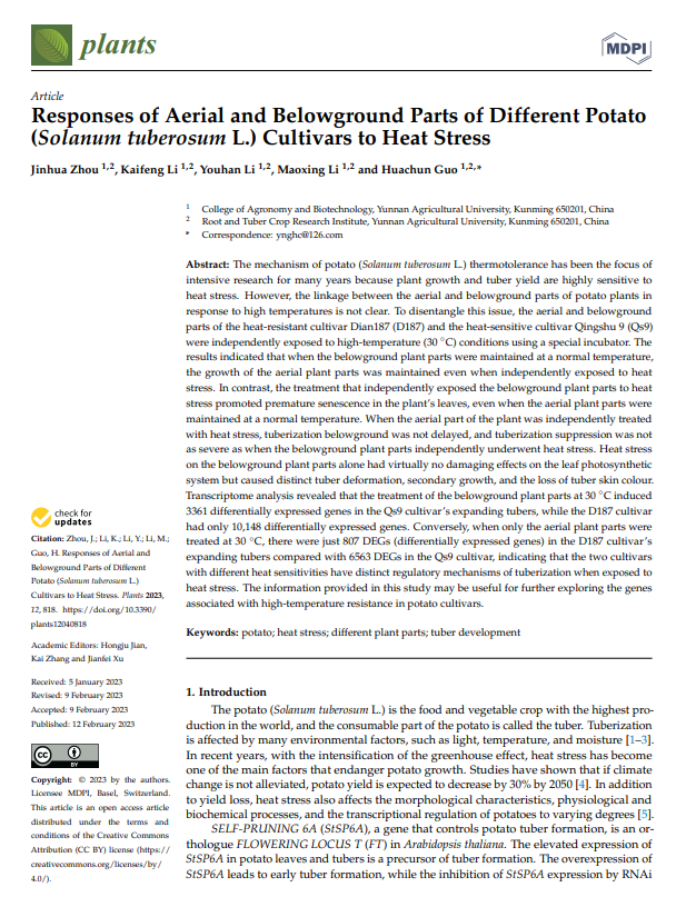 我校薯类生理生态与种质创新团队在国家马铃薯产业技术体系、省科技厅、农业农村厅和学校的支持下潜心研究,新年伊始科研取得新进展:自主选育的‘滇薯