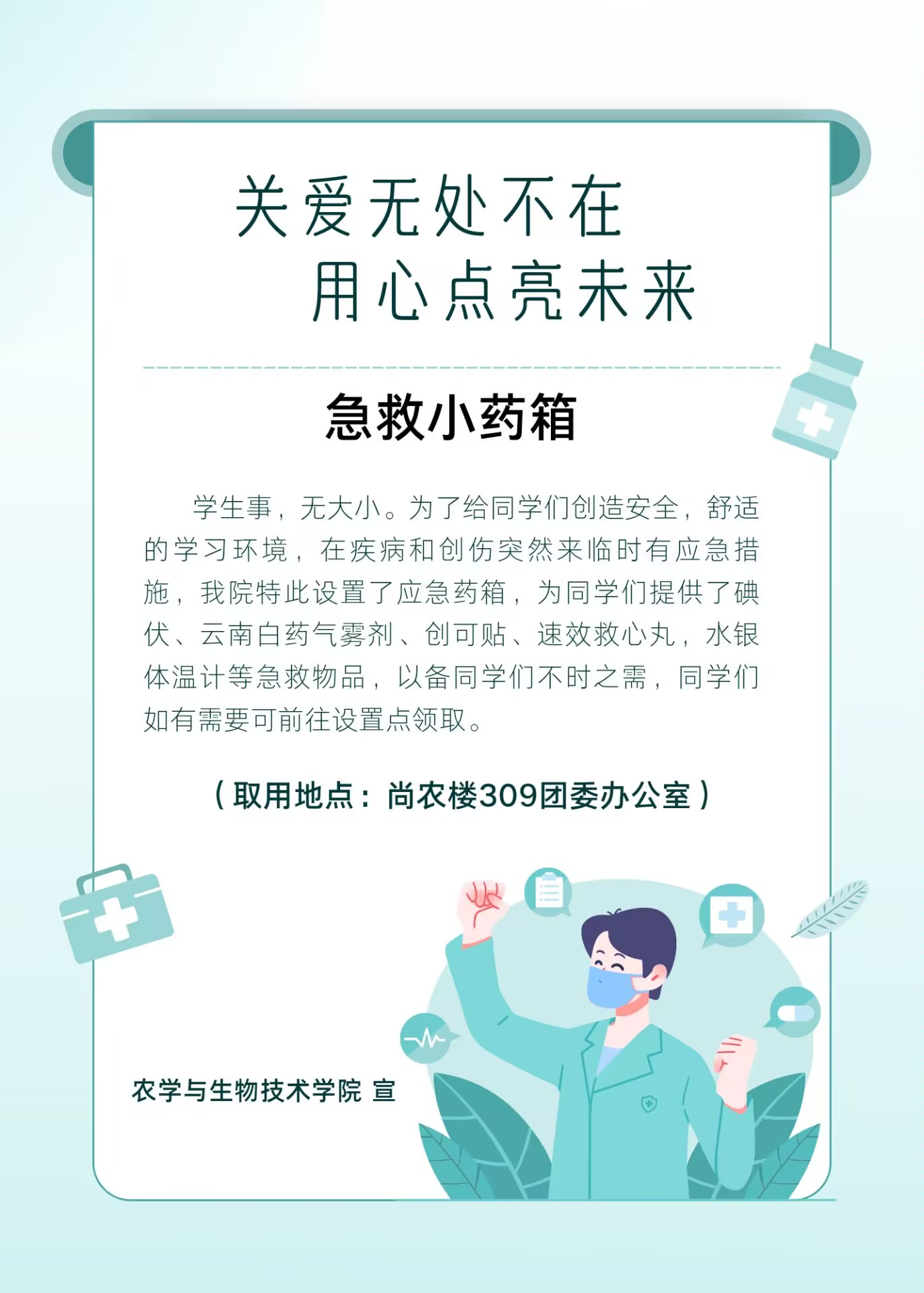 为了给尚农楼上课同学们创造安全,舒适的学习环境,在疾病和创伤突然来临时有应急措施,独播库在院团委办公室(尚农楼309)特意设置了应急药箱,为同学们提供碘伏、云南白药气雾剂 、创可贴、速效救心丸、水银体温计等急救物品。