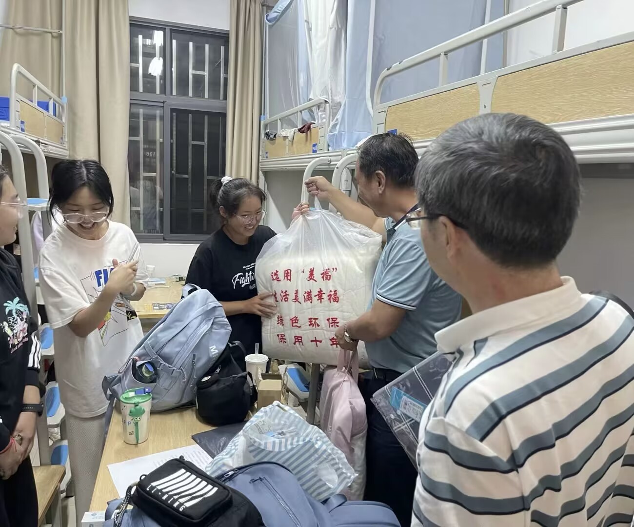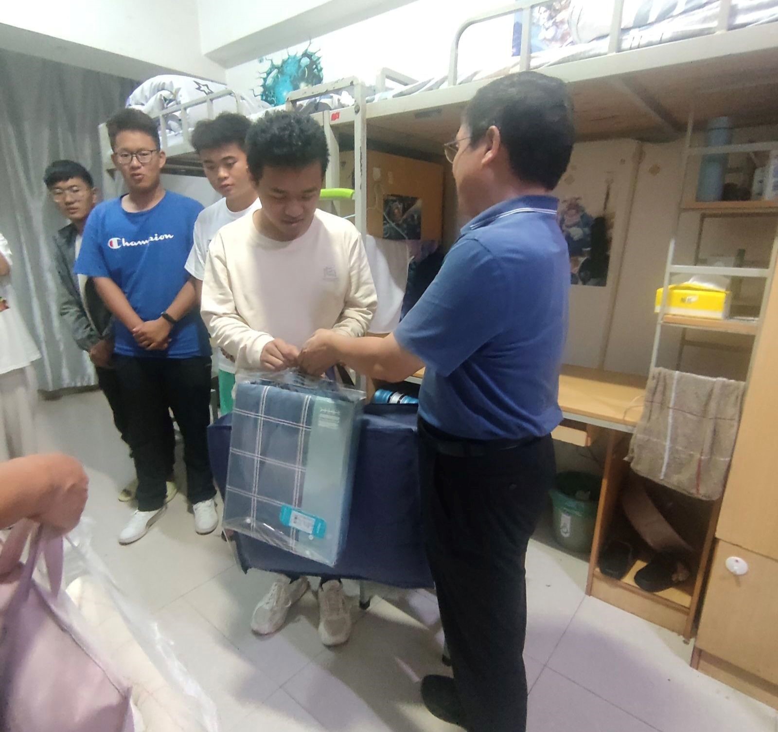 领导代表学校向同学们赠送了床单被褥等生活用品,并再次叮嘱同学们:“在学习和生活上有任何问题,都可以找班主任、辅导员,希望同学们在未来的大学生活中都能有所收获有所成长。”